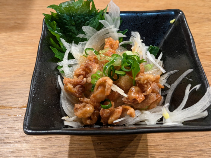 鳥皮と玉ねぎのスライスをポン酢で味付けしたもの。