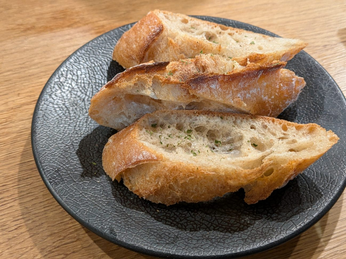 アヒージョを単体で注文していたら、スタッフさんがパンは大丈夫ですか?と聞いてくれたので頼むのを忘れていることに気づきました。やっぱり、パンがないとね!